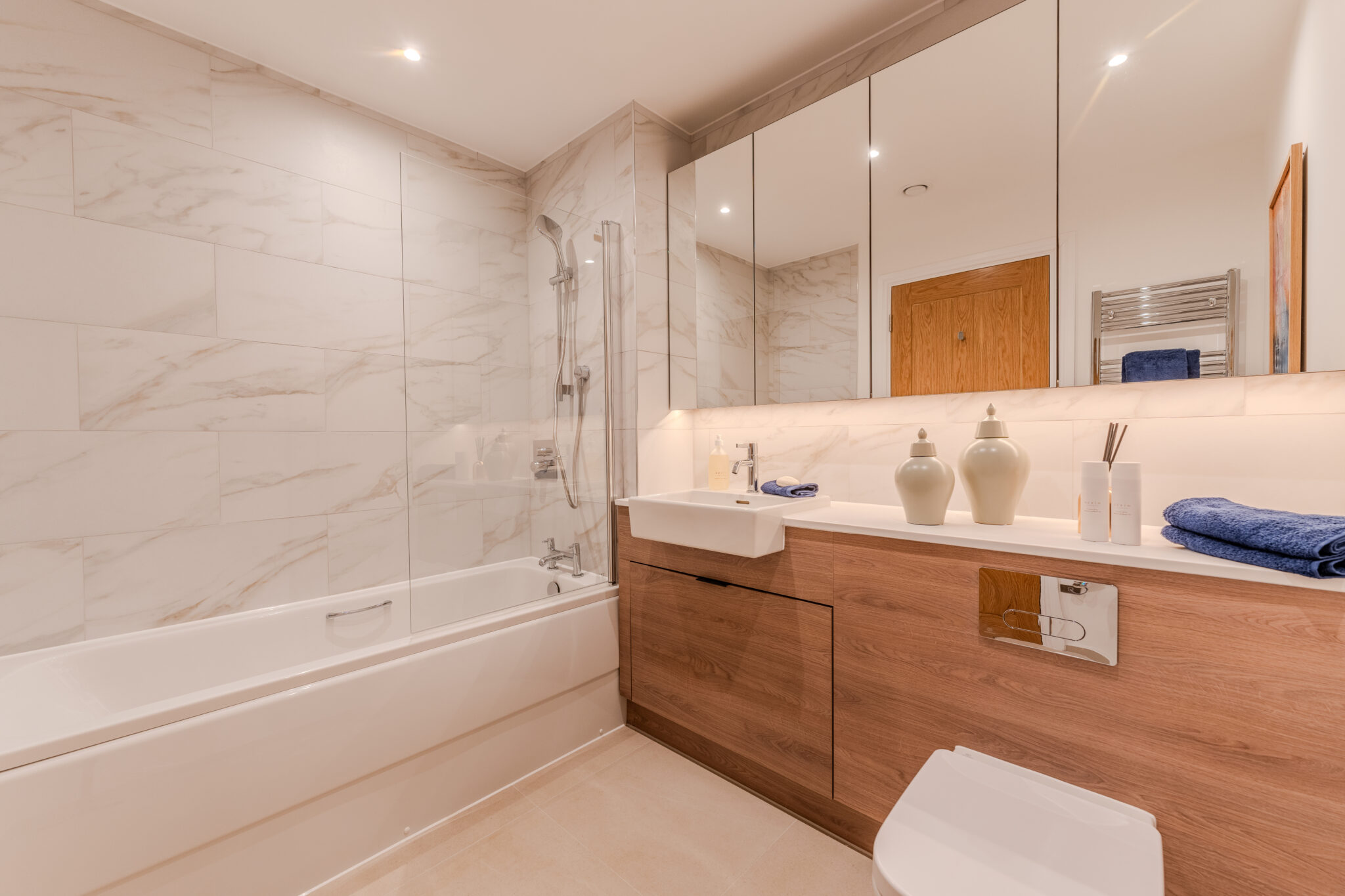The property has an ensuite shower room with walk in shower, along with a bathroom including vanity cupboard below the sink, heated towel rail and mirror. Both rooms are created with use of sanitary-ware and ceramic tiling. The utility cupboard with built in storage also includes a washer dryer.